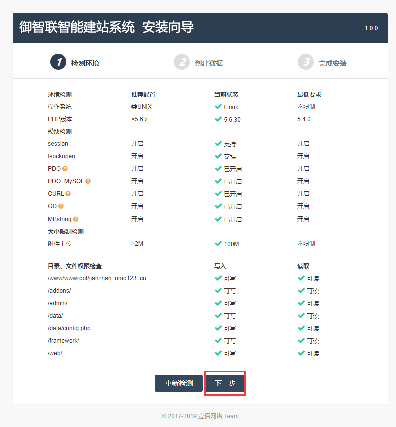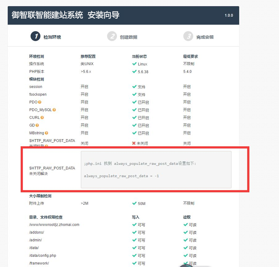 九、如果初次安装御智联智慧建站系统,检测环境时会出现下图所示的情况