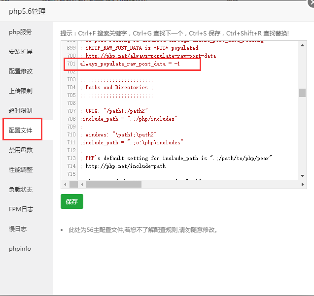 修改PHP5.6的配置文件,找到always_populate_raw_post_data,把分号去掉,保存,重启PHP即可(windows面板的话,找到php5.6所在文件夹,打开php.ini,找到always_populate_raw_post_data,修改为always_populate_raw_post_data=-1,保存php.ini,重启WEB服务即可。)
