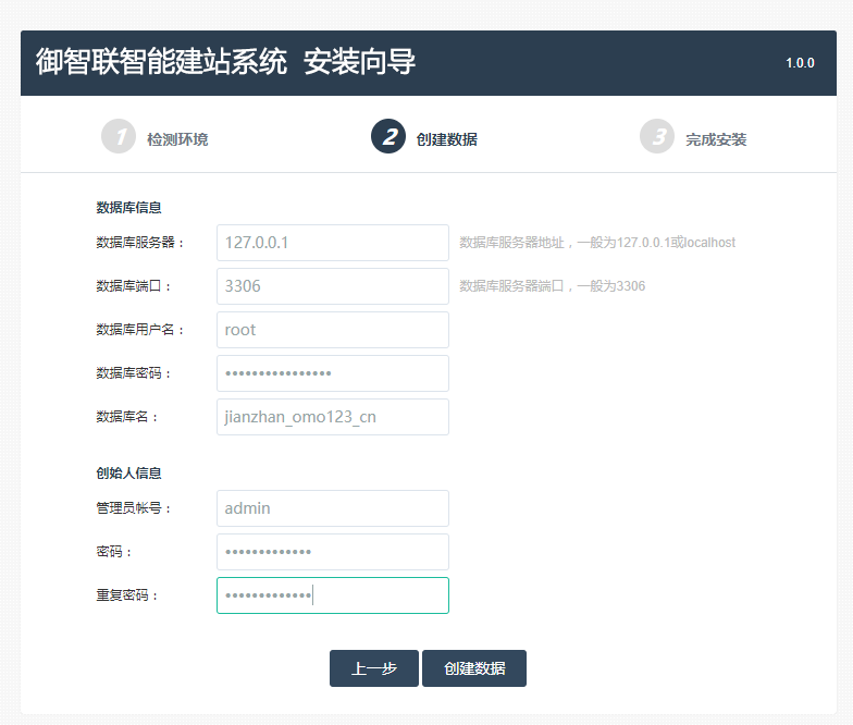 四、填写数据库名、密码和数据库用户名及管理员信息,进行创建数据操作