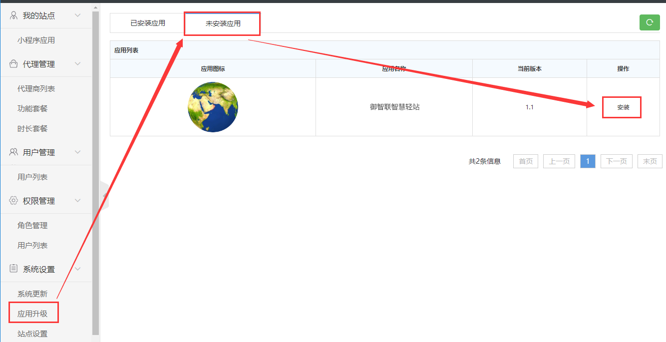 七、点击左侧菜单【应用升级】-【未安装应用】,点击安装即可(可先将系统框架更新至最新版本)
