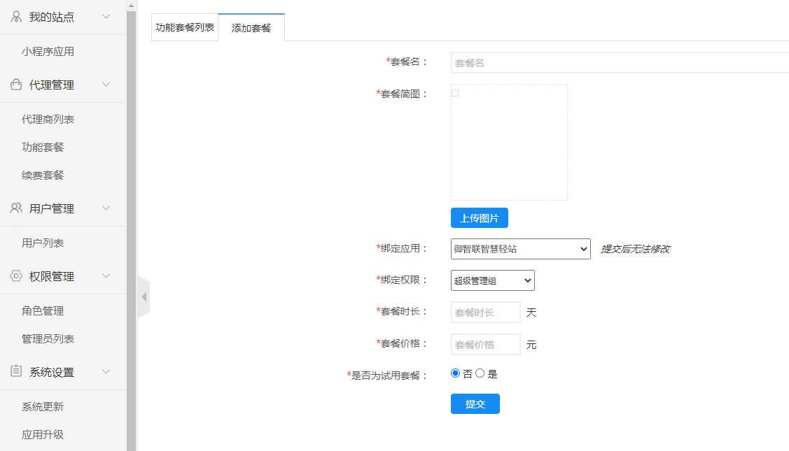 登录独立版后台,打开代理管理页面,点击功能套餐-添加套餐,设置好套餐名称、套餐简图、绑定权限(选择默认权限组)、套餐时长、套餐价格等,点击提交按钮,可添加功能套餐。