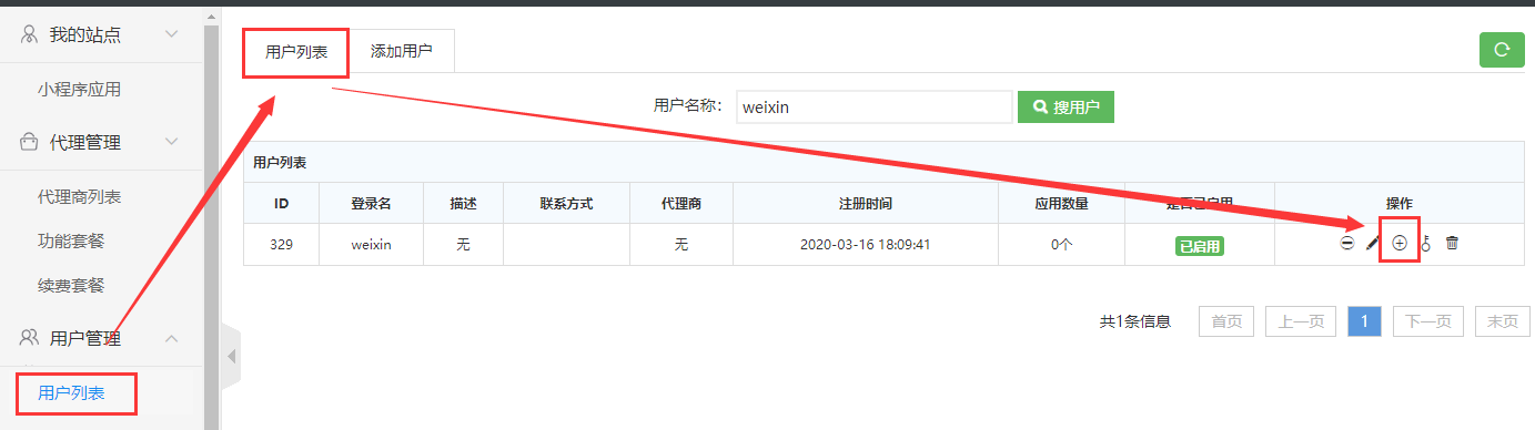 二、在用户列表找到刚创建好的用户账号,为用户创建小程序应用