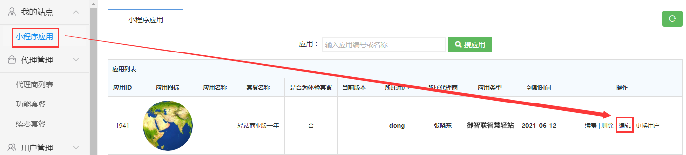三、在【小程序应用】页面上【编辑】小程序信息,或是使用普通用户账号登录后台【编辑】小程序信息后,可登录轻站应用后台