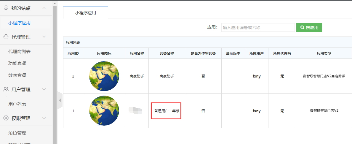 一、在独立版后台,打开【小程序应用】页面,找到需要续费的小程序应用,查看当前小程序使用的套餐名称,如当前套餐名称为【普通用户一年版本】。