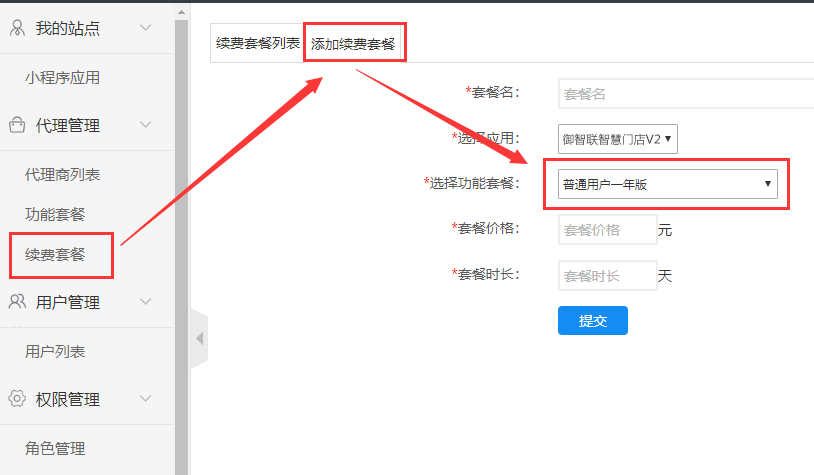 二、在【续费套餐】页面,点击】添加续费套餐】,填写套餐名称,选择相应的应用及套餐,设置价格及时间,点击【提交】按钮