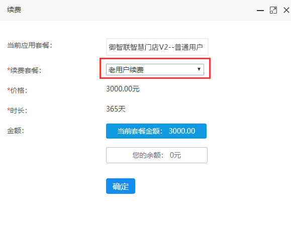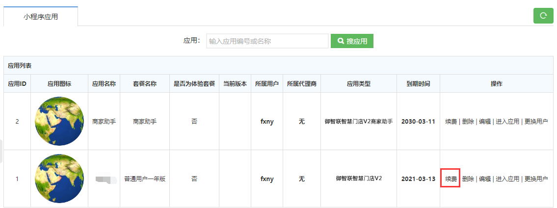 三、在【小程序应用】列表找到需要续费的小程序,点击【续费】链接,在弹出窗口中选择刚创建好的续费套餐,点击【确定】,完成续费操作。